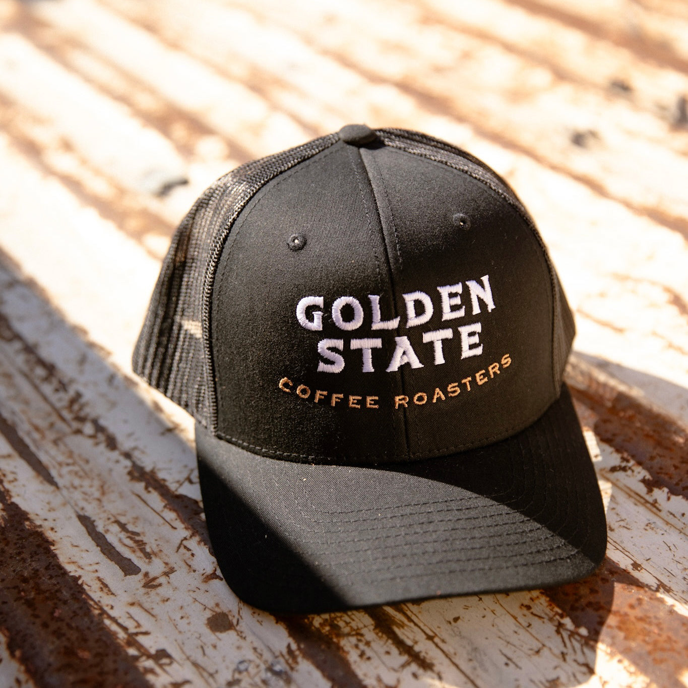 The front features the iconic Golden State Coffee Roasters logo embroidered in white and gold, symbolizing our commitment to excellence in every roast. The mesh back ensures breathability, keeping you cool and comfortable whether you're sipping a latte by the beach or exploring the city streets.